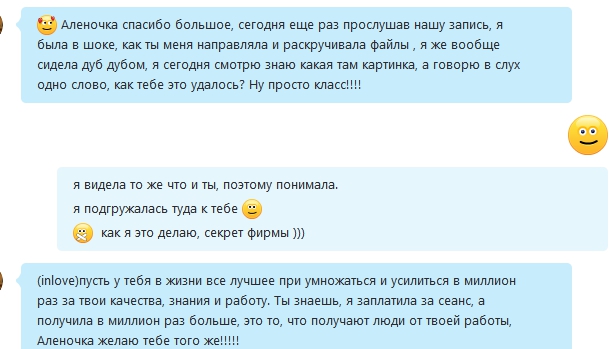 Дорогие клиенты, поймите, меня не нужно хвалить. Вообще я, как мастер, могу сделать и больно. Мы вытягиваем из подсознания иногда не только конфеты, а и горькие осознания – истинный ответ Пространства, за чем, собственно, и пришли.
