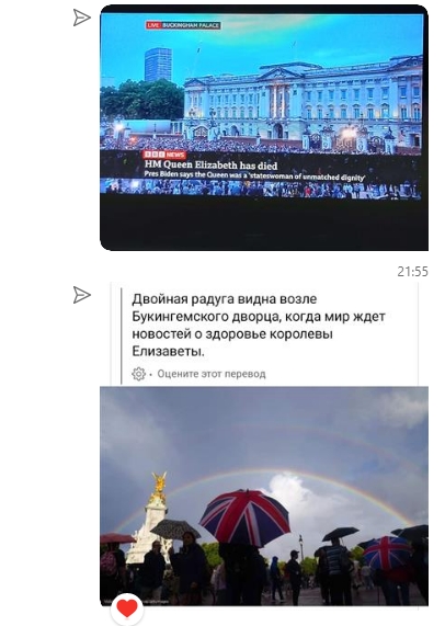 И что удивительно, такой спецэффект - у Букингемского дворца при тысячах свидетелей и в онлайн- эфире -- вдруг открылась огромная двойная радуга,