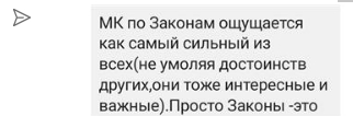 МК по Законам ощущается как самый сильный из всех(не умоляя достоинств других,они тоже интересные и важные).Просто Законы -это фундамент, отсюда и такое восприятие.Ведь важно на каком фундаменте мы строим свою жизнь.