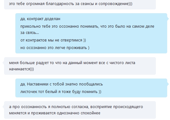 Очень познавательно. Именно на третьем сеансе у меня окончательно развеялись сомнения что это всё моя фантазия. В сеансе мы смотрели что меня связывает с тремя людьми и вот когда на третьем мне показали чистый лист А4 я была поражена)