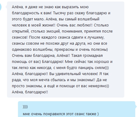 Я потом анализировала, как я додумалась задать тот самый вопрос, который так развернул ей сеанс?) И поняла, что эту назойливую, настойчивую мысль мне прислали ее Наставники. Я лишь почувствовала ее в поле.