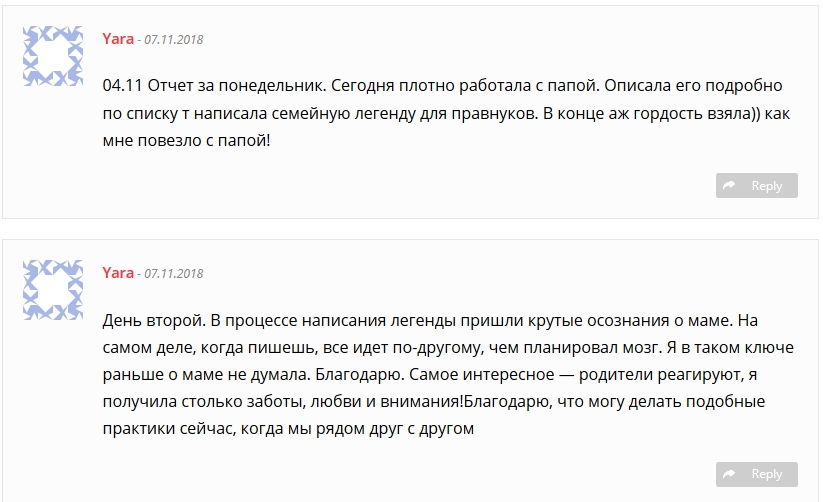 Я осознала силу семейных сценариев, отследила самые яркие в своей жизни и жизни родителей. Самое главное — я винтик огромного механизма, за моей спиной такой большой и сильный род — это понимание и ощущение мега-важно.